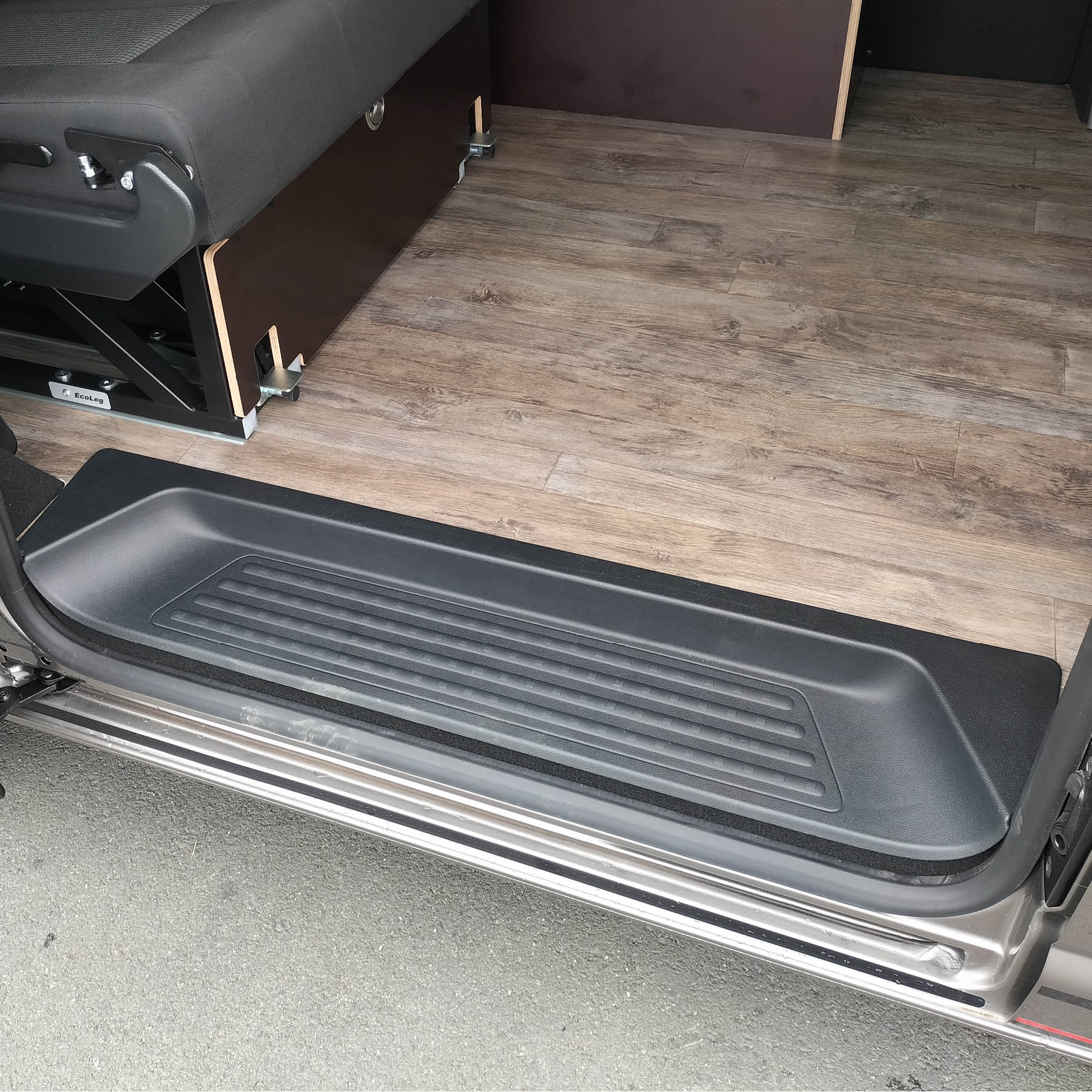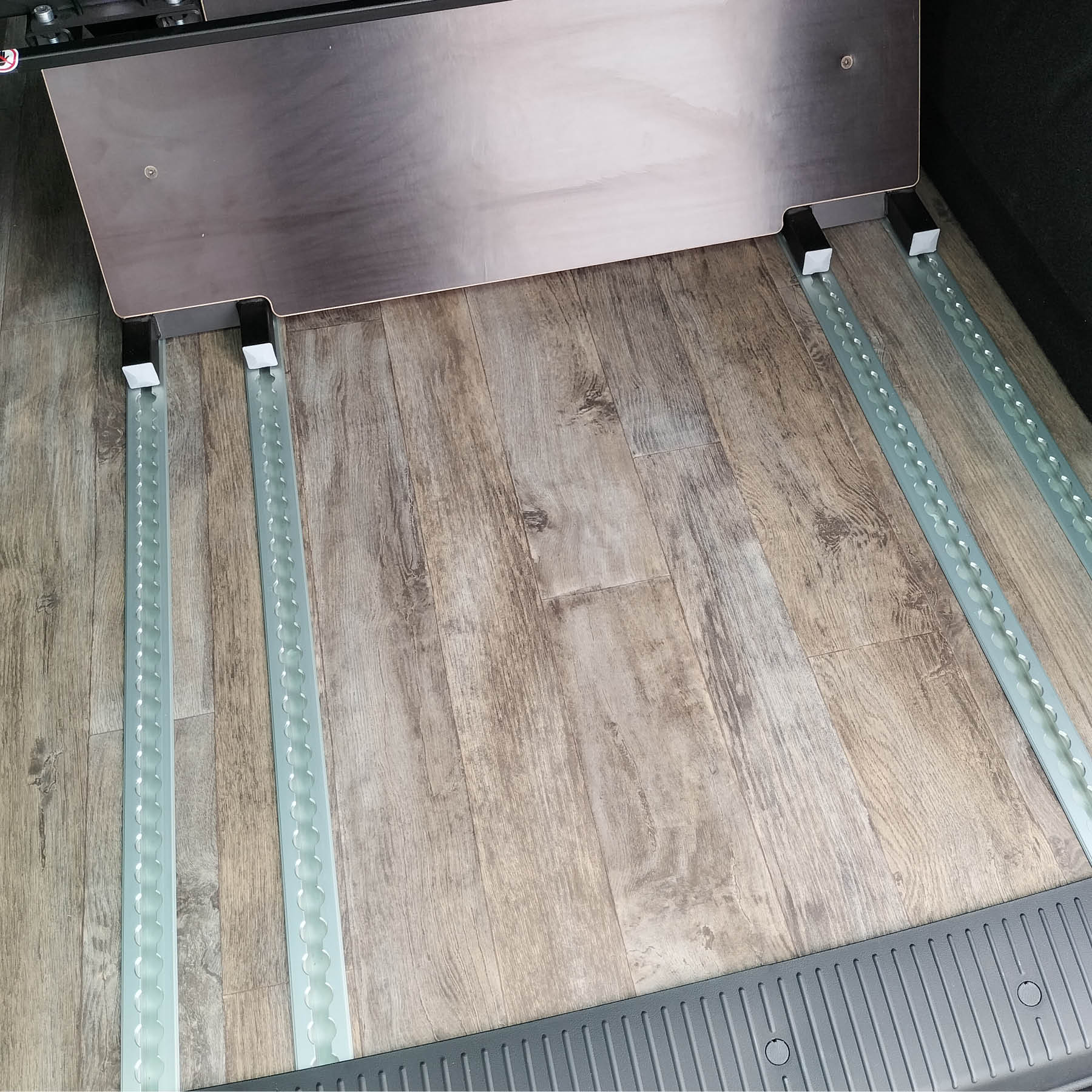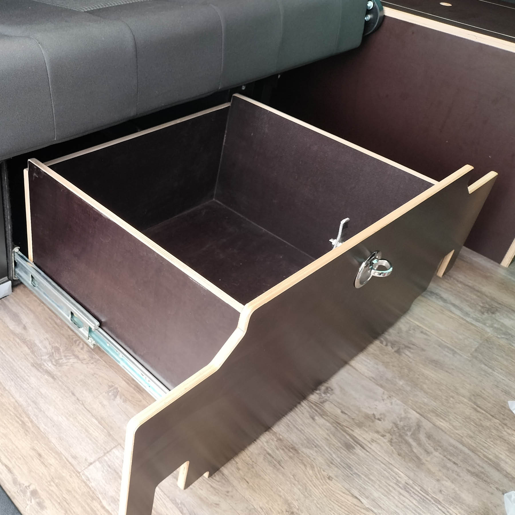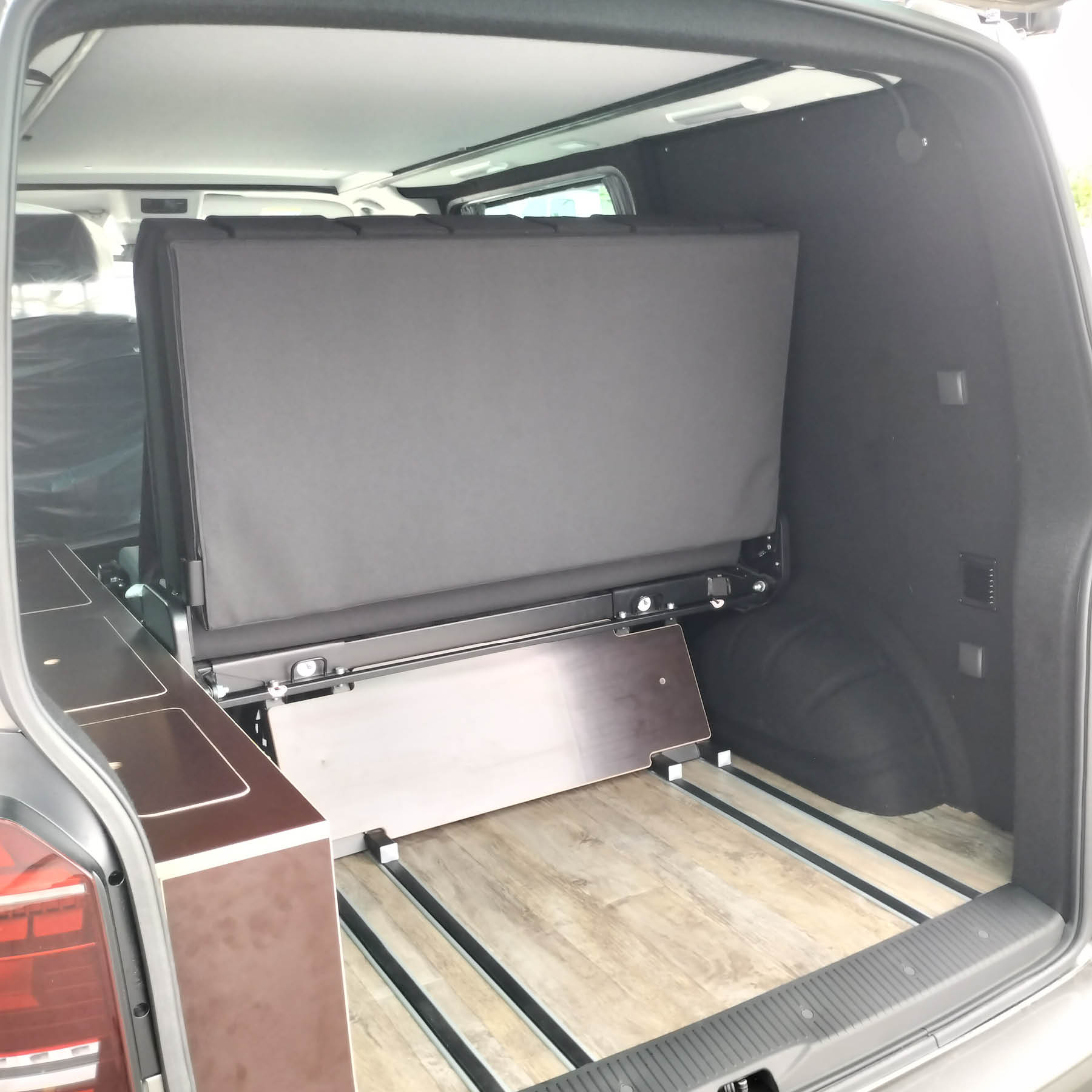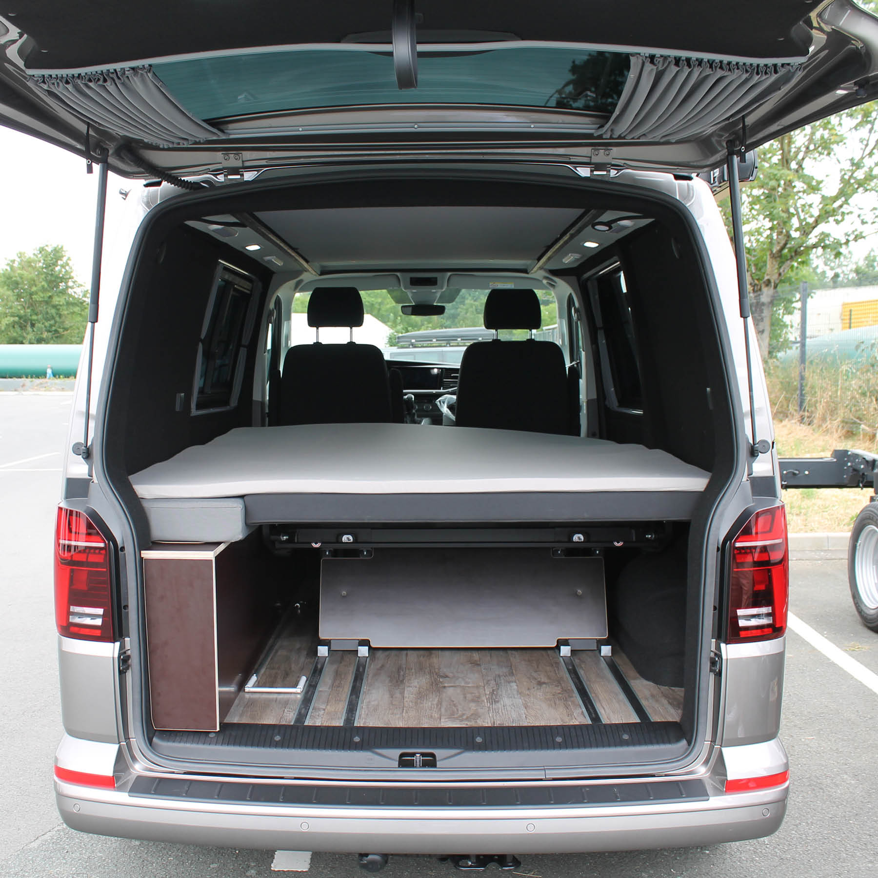 - Meuble fixe coté chauffeur à l’arrière sur la longueur de la banquette dépliée avec trappes et 2 compartiments
